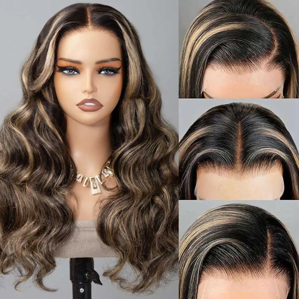 Glueless Brown Mixed Blonde Highlights Loose Wave Long Wig