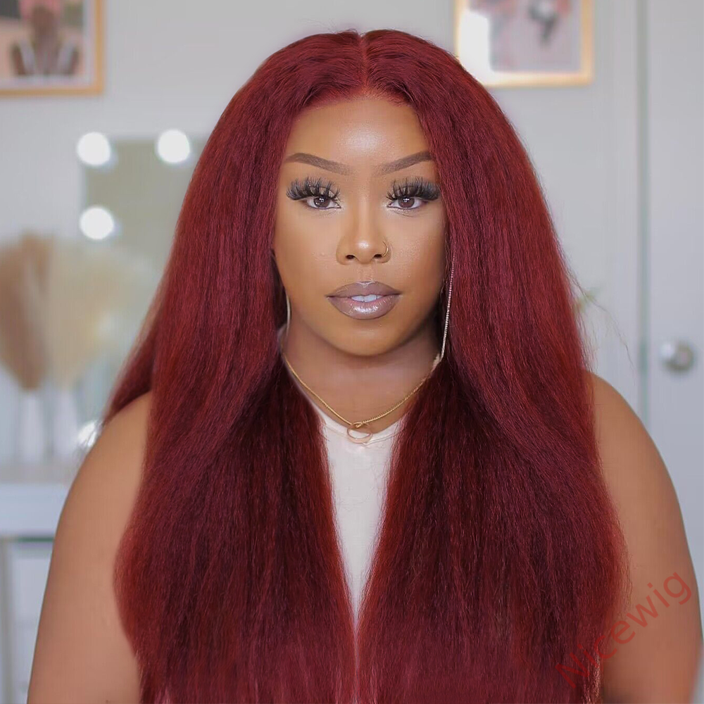 Glueless Wine Red Kinky straight 200% density glueless brazilian wigs