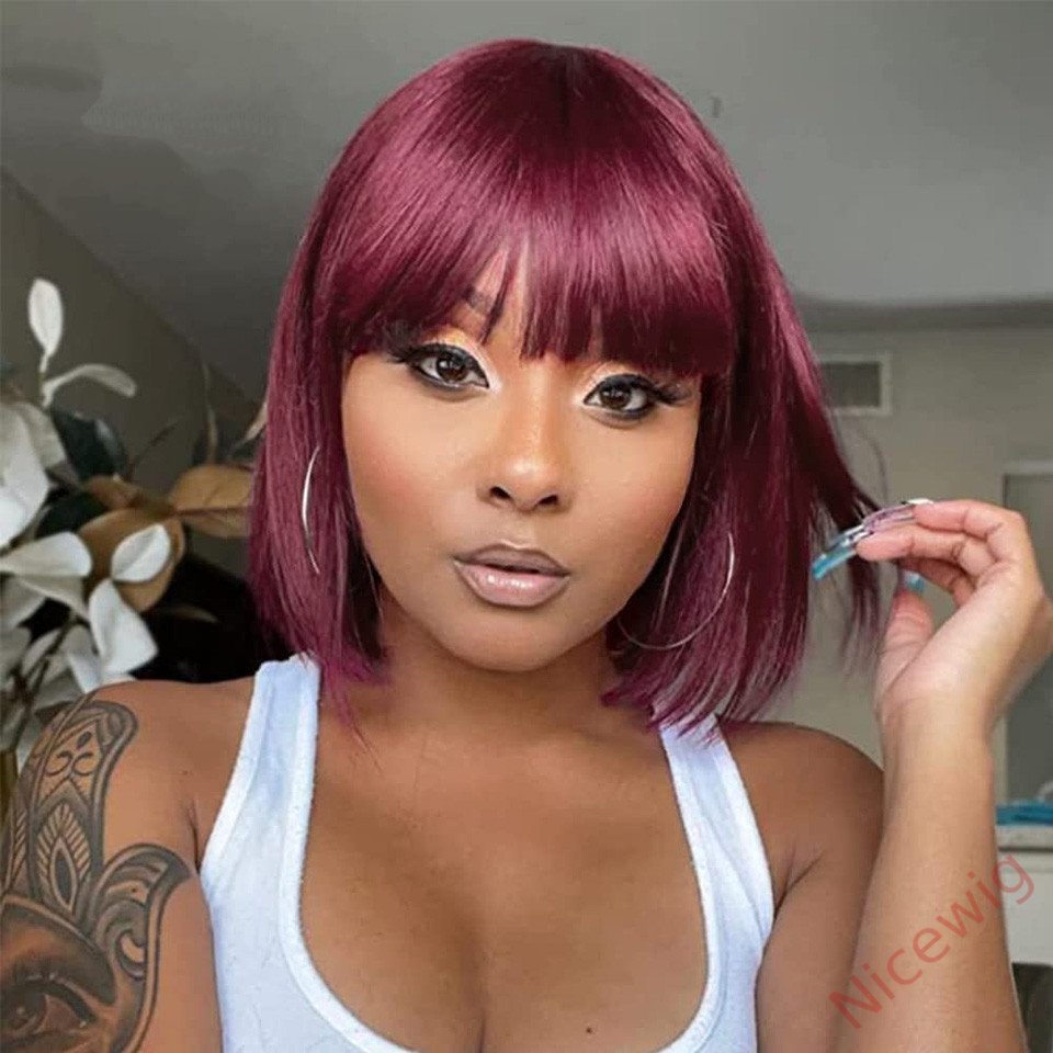 Glueless Wine Red Straight Hair Short BOB Wigs With Bangs