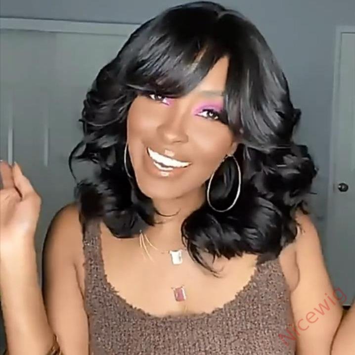 Natural Black Medium Hair Bob Body Wave Wig With Bangs