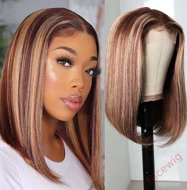 Straight Bob Wig Brown Mixed Blonde Highlights Wig